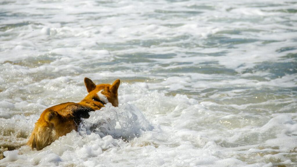 Foto: Ein Hund läuft durch schäumendes Wasser