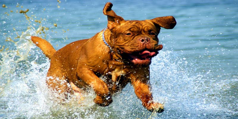 Foto: Eine Bordeaux Dogge läuft durch spritzendes Wasser